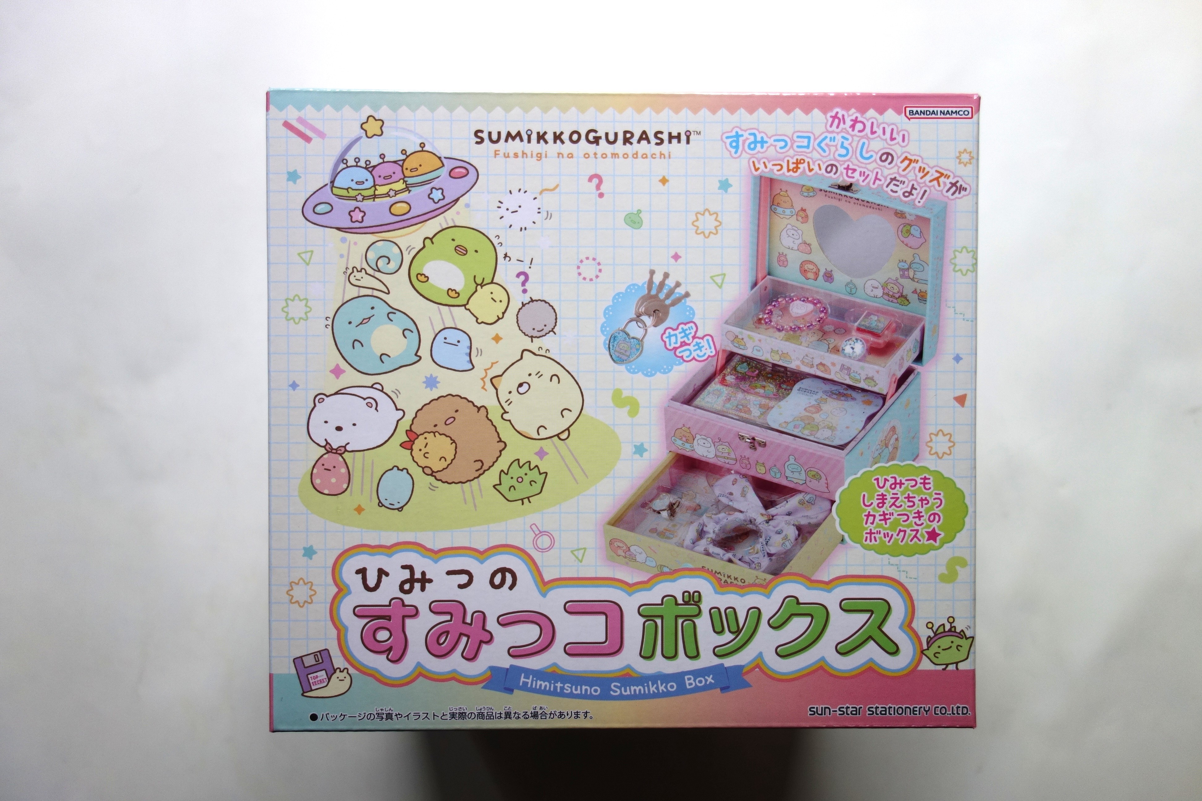 すみっコたちがいっぱいのとてもかわいいひみつのすみっコボックス。ひみつもしまえるカギ付きの3段のボックス。この中にはリボンシュシュほじめシール・ハートブレスレット・リングスタンオウ・ダイカットメモほかキーセットなど小物でいっぱい。箱寸法は横195×縦177×奥177㎜。JAN=4901771130575