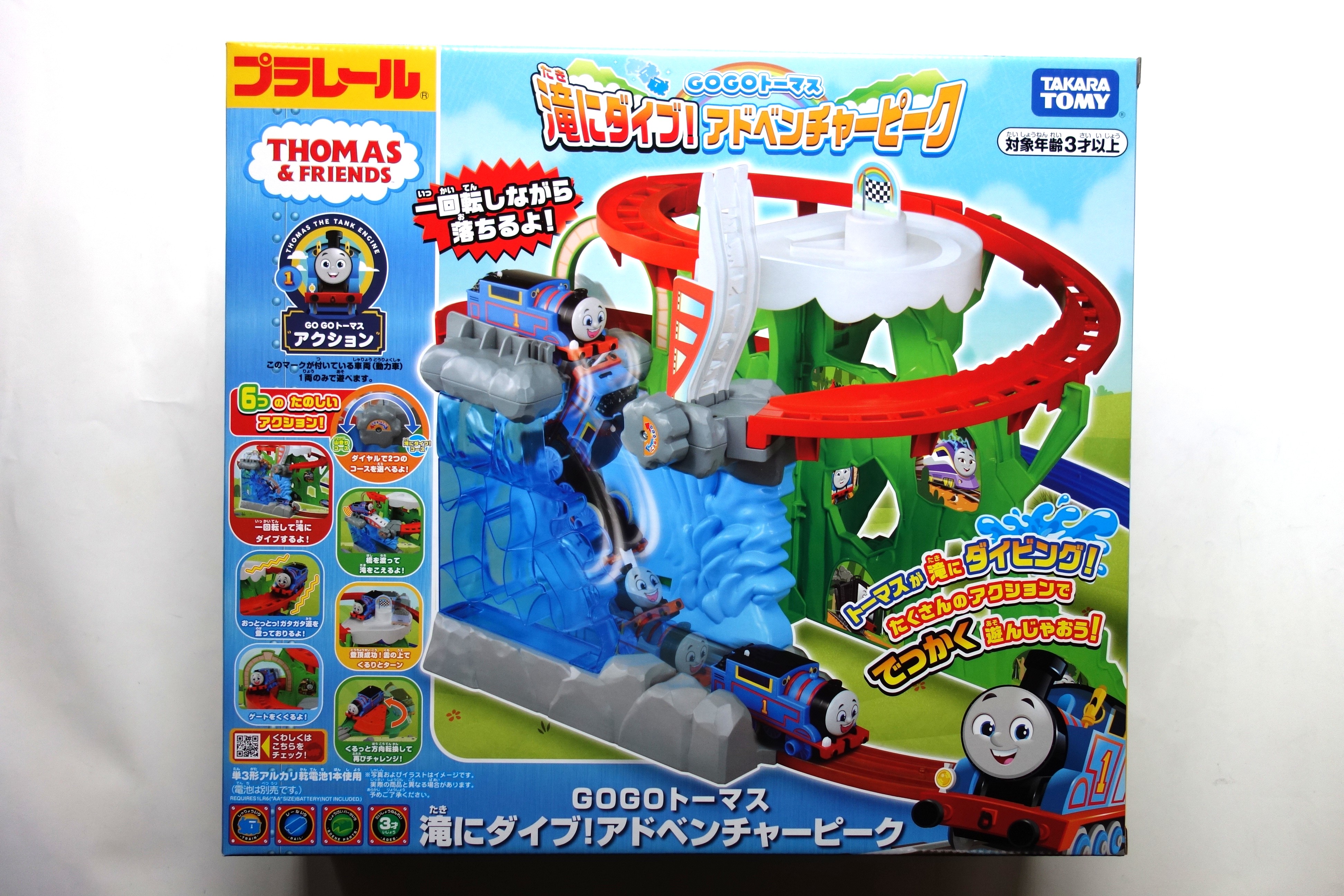 トーマスが一回転しながら滝にダイビングしたり、ガタガタ道を上って下りたり、ぐるっと方向転換したり、橋をわたって滝を超えたりほかたのしいアクションが盛りだくさんのトーマスアドベンチャーピーク。箱寸法は横410×縦365×120㎜。JAN=4904810907640
