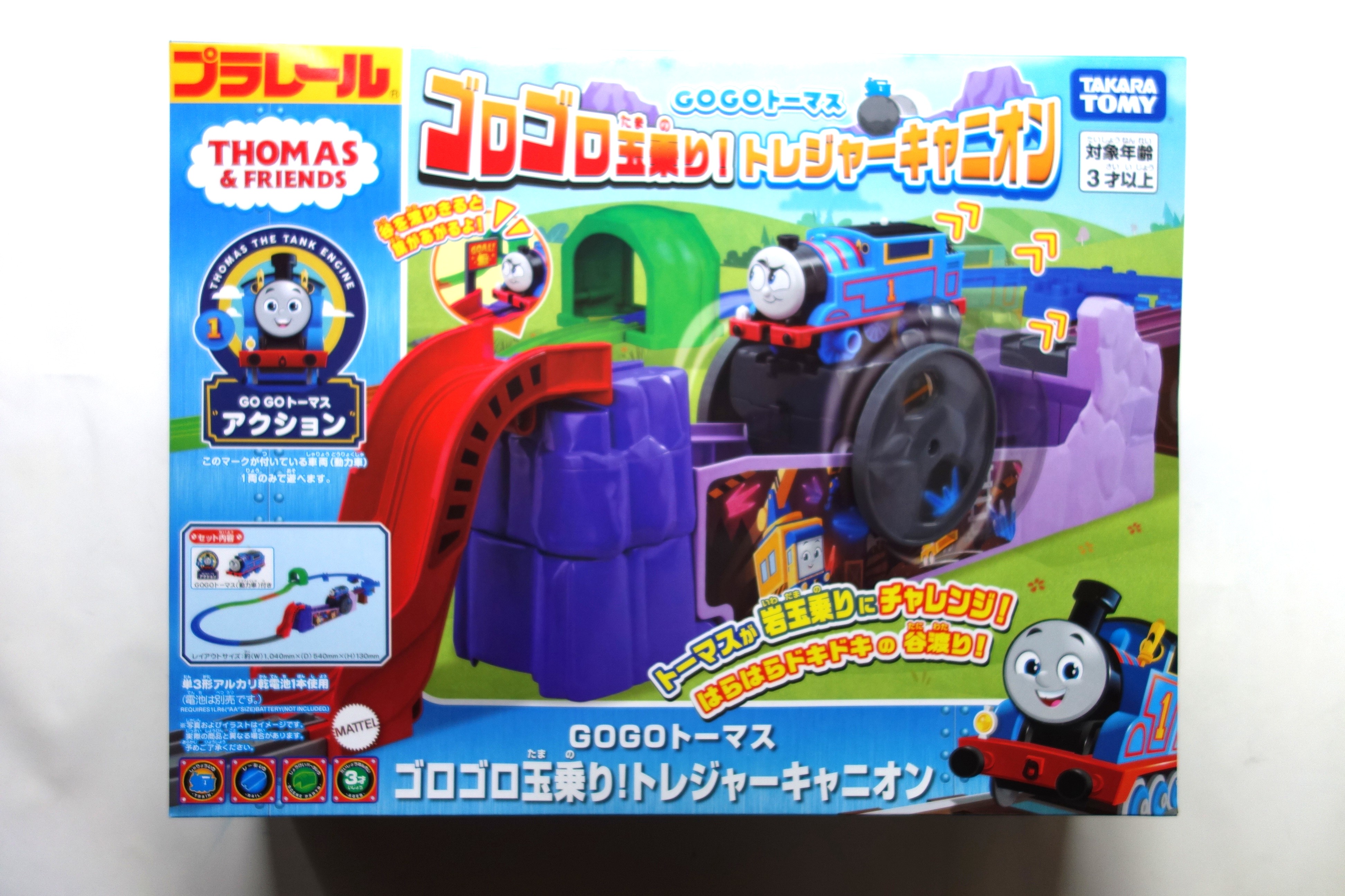 GOGOトーマスがぐるっとループを宙返りしたり、元気に山を越えて出発進行。終点ではほし草や木箱を押しのけてグルットUターンGOGOトーマスが1両付きです。箱寸法は横410×縦365×奥120㎜。JAN=4904810223849