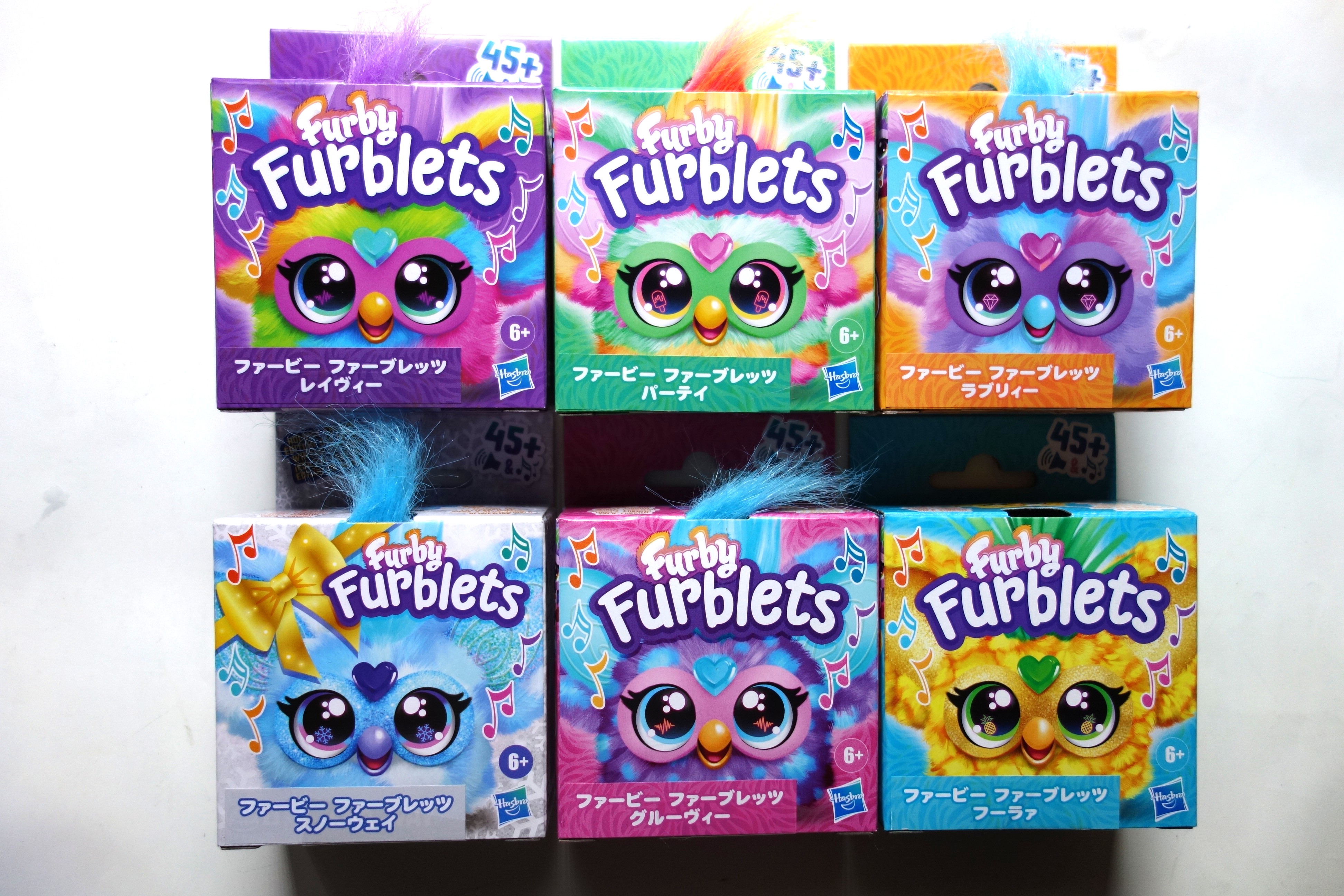 ※5%引き感謝セール実施中。ファービーの小型版のファーブレッツの12種類です。写真では6種ですが、1単位24個で各2個づつの12種類です。口やハートボタンをおしたり、頭をポンするとファービー語でおしゃべりや歌を歌ってくれる又、45種類以上の音や歌の組み合わせ反応をするよ。フック付きです。箱箱寸法は横95×縦95×奥52㎜。JAN=代表5010996以下は209405・209382・281548・273888・209368・281524・273901・281500・273918・281517・273895・209399・259615。