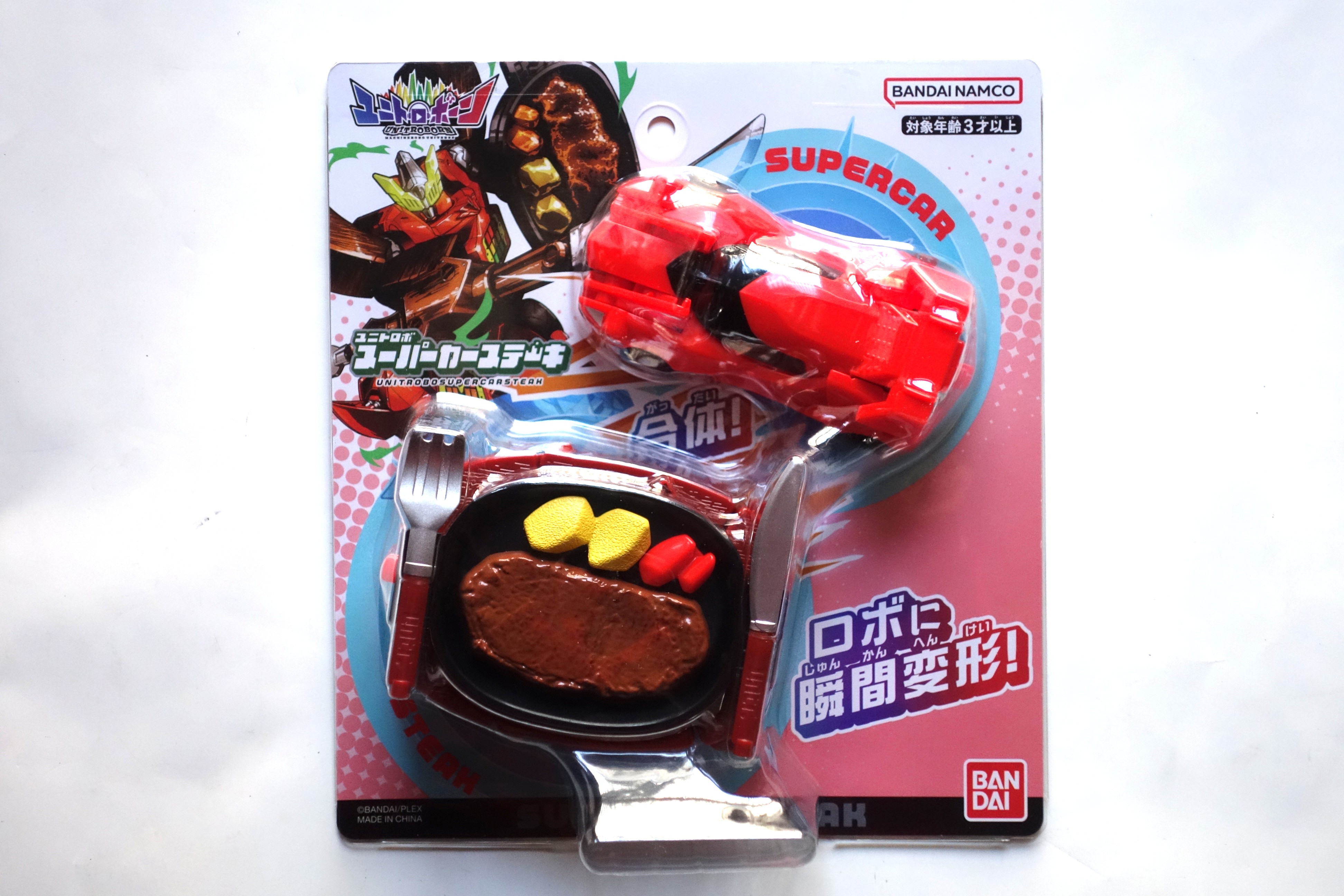 身近にあるあらゆるモノがありえないように合体するロボシリーズのユニトロボーン。ユニトロボーンの仲間のスーパーカーとステーキが瞬時にロボに変形するユニトロボの変形ロボ。台紙寸法は横200×縦220㎜。JAN=4549660824961