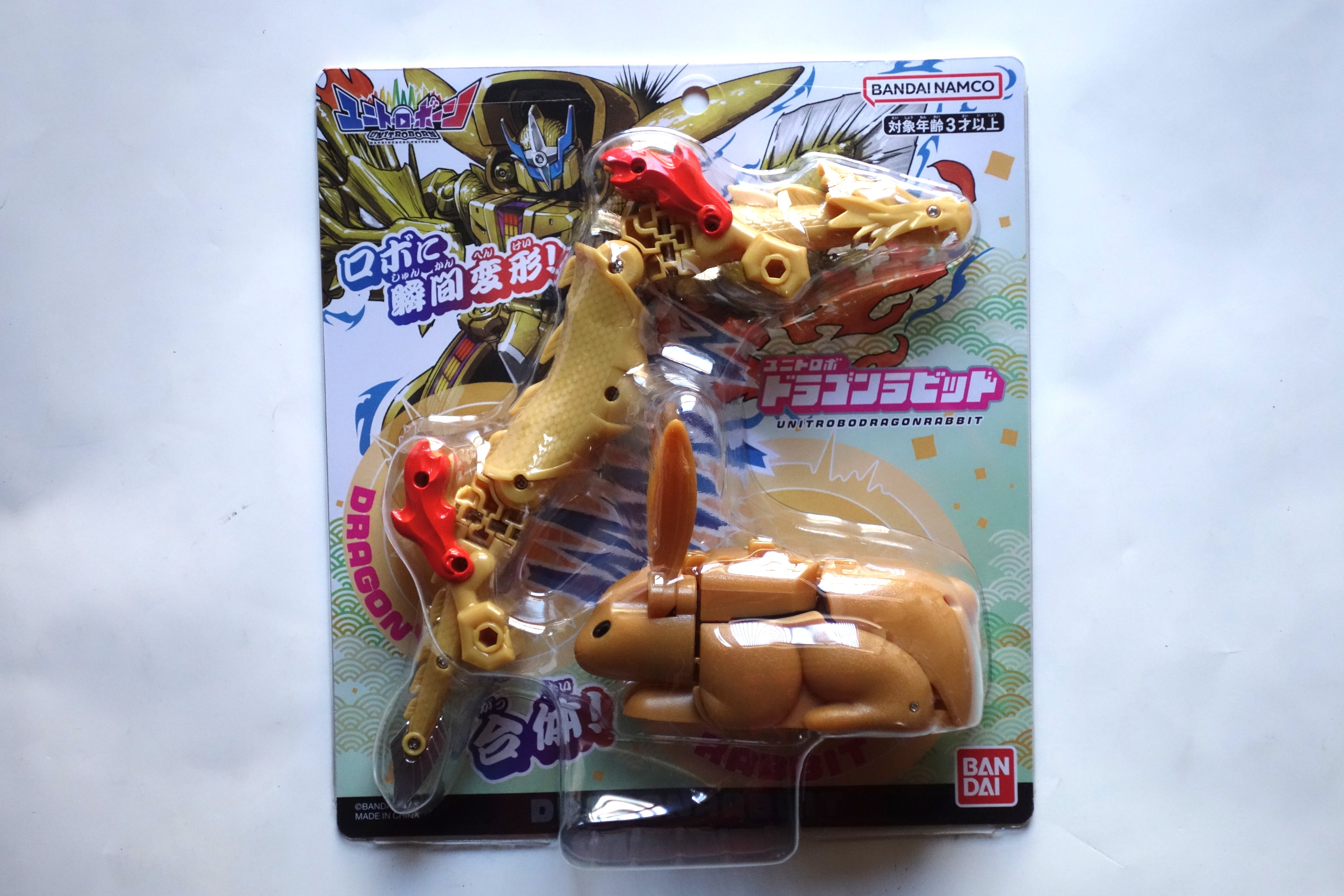 身近にあるあらゆるモノがありえないように合体するロボシリーズのユニトロボーン。ユニトロボーンの仲間のドラゴンとラビットが瞬時にロボに変形するユニトロボの変形ロボ。台紙寸法は横200×縦220㎜。JAN=4570118097224