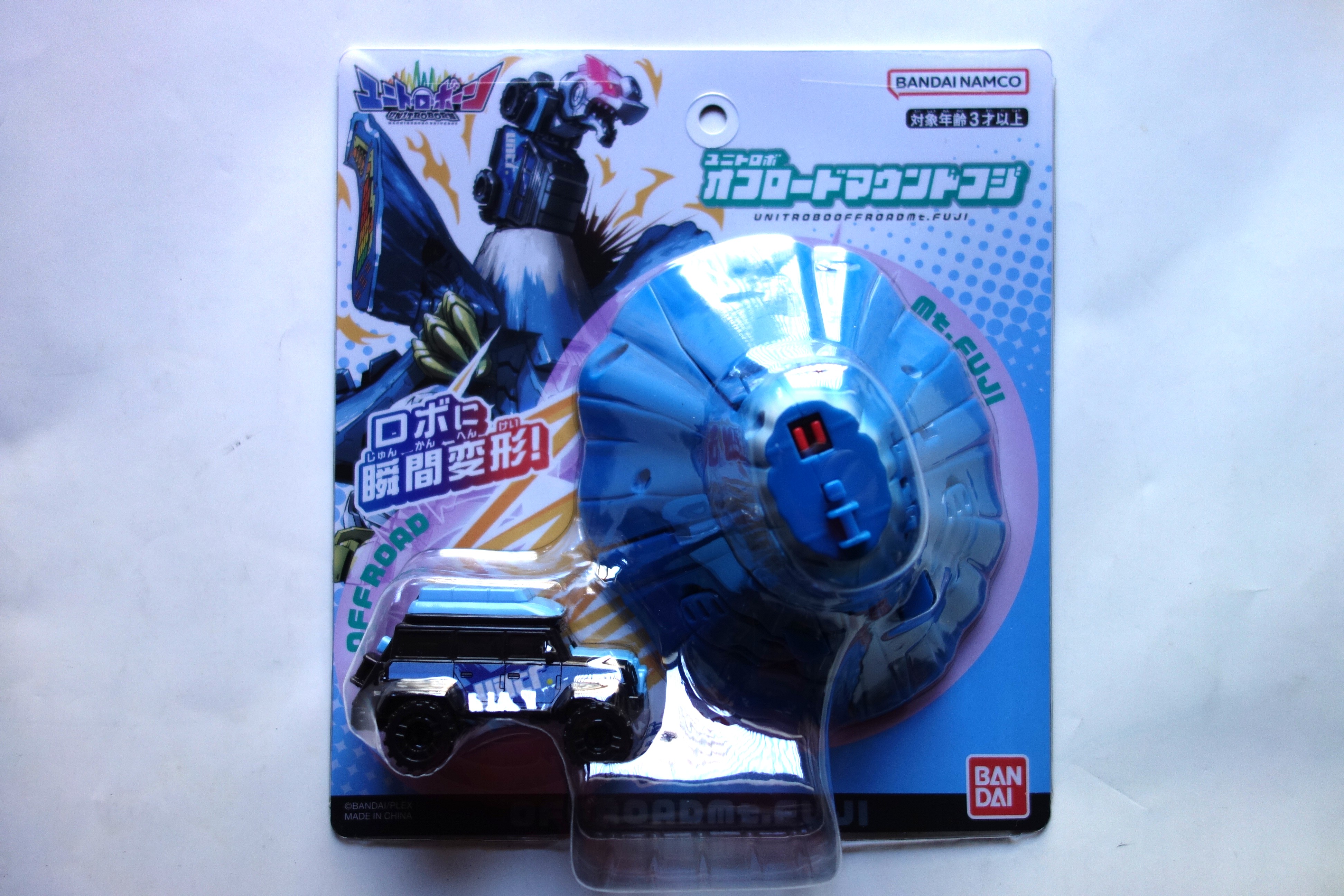 身近にあるあらゆるモノがありえないように合体するロボシリーズのユニトロボーン。ユニトロボーンの仲間のオフロードマウントフジが瞬時にロボに変形するユニトロボの変形ロボ。台紙寸法は横200×縦220㎜。JAN=4570118097231