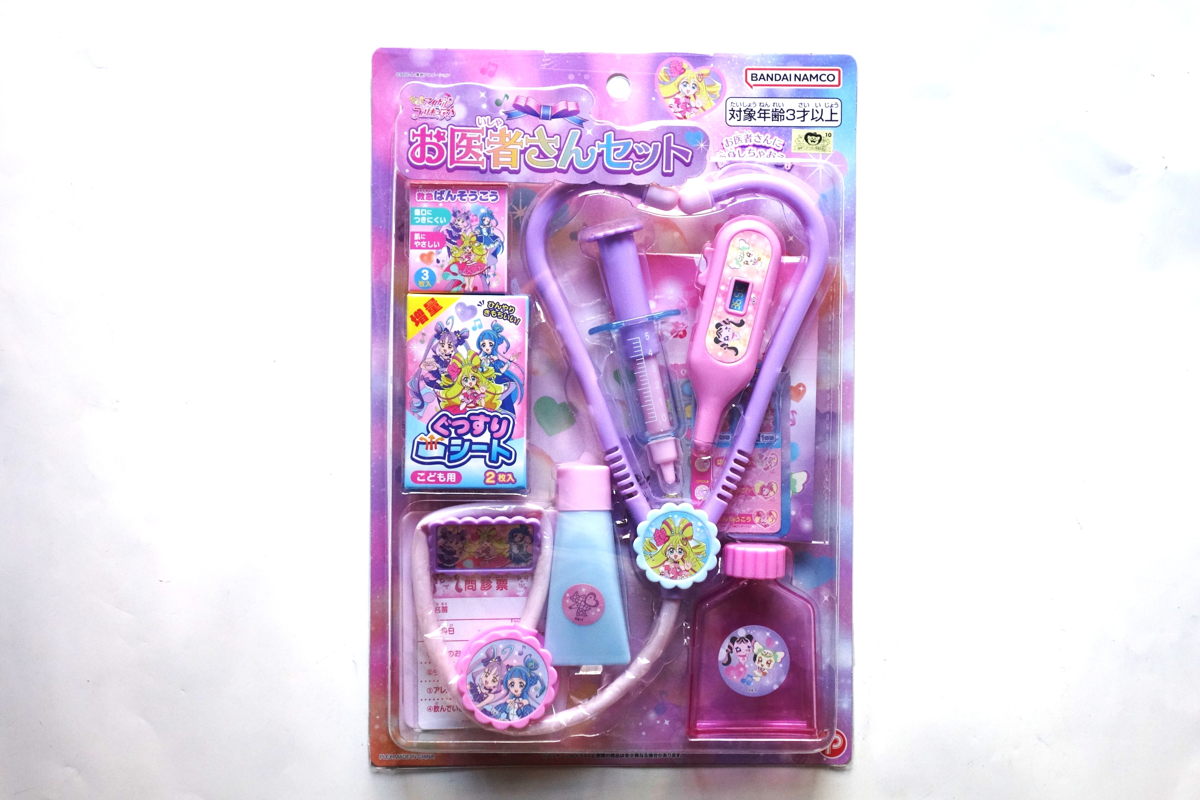 アイドルプリキュアのお医者さんに変身出来ちゃうちょうしんきやちゅうしゃ器・たいおんけい・くすりびんほかお薬袋などほかバインダーのもんしんちょうなどセットがいっぱいのお医者さんセット。台紙寸法は横210×縦310×厚み約27㎜。JAN=4902923157655